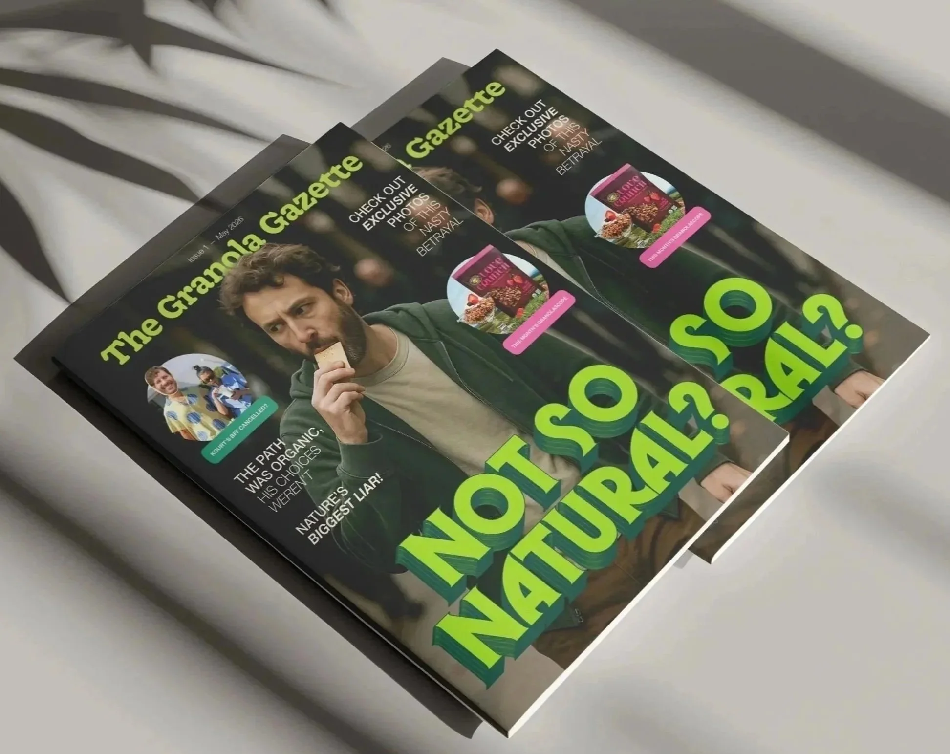 Inside each newsstand, visitors could grab a free Tiger Beat style gossip magazine created just for the stunt. Filled with absurd granola themed features like a “Granolascope,” fake celebrity snack sightings, and a dramatic two page spread covering the betrayal, the tangible magazine would tap into nostalgia while making the gossip feel authentic. Giving them away for free would encourage people to take them, share them, and post them, extending the scandal beyond the streets and into social feeds.