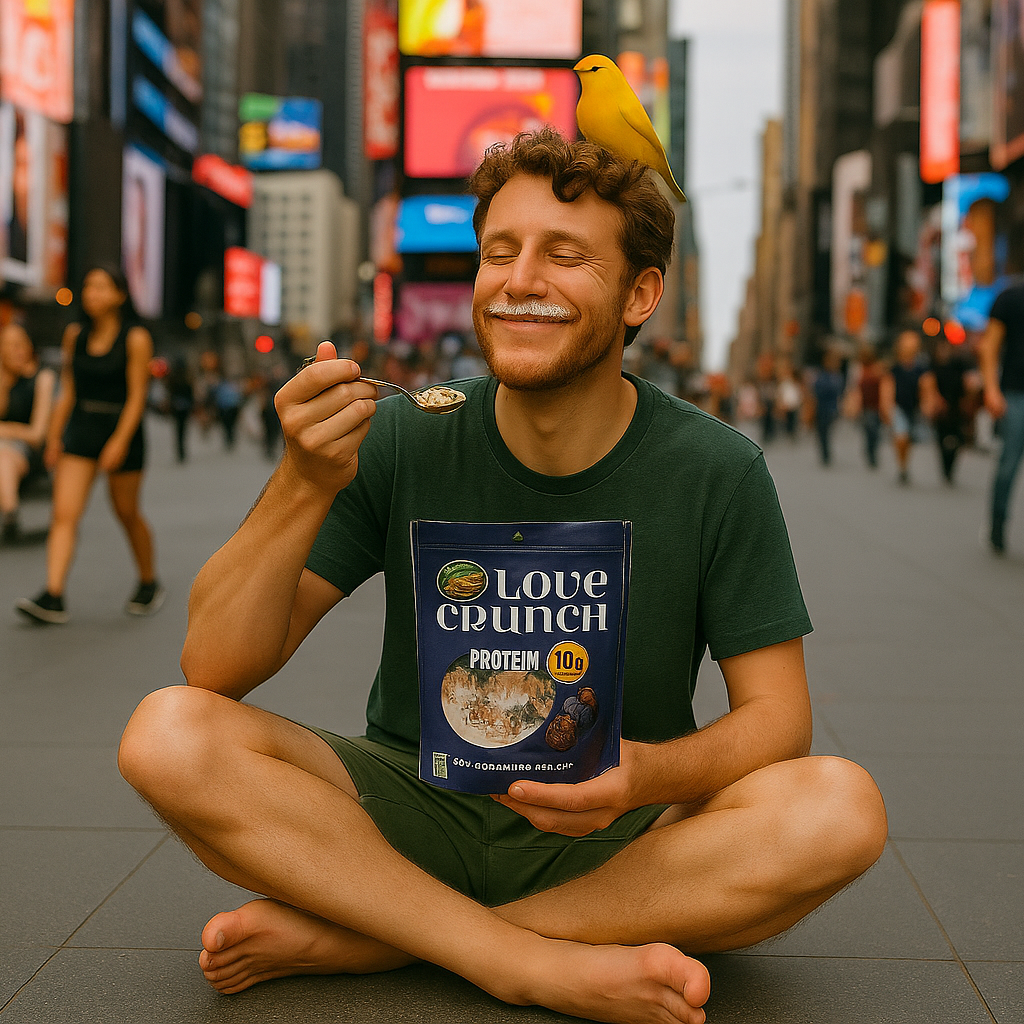 From there, the attention would be amplified with a Times Square stunt: Brother Nature barefoot, eating Love Crunch straight from the bag with milk and a spoon. This strange yet endearing visual would generate organic media in addition to being captured by street-interview creators like What’s Poppin?, Caleb Simpson, and What Is New York, making him a recognizable and slightly eccentric personality worth talking about.